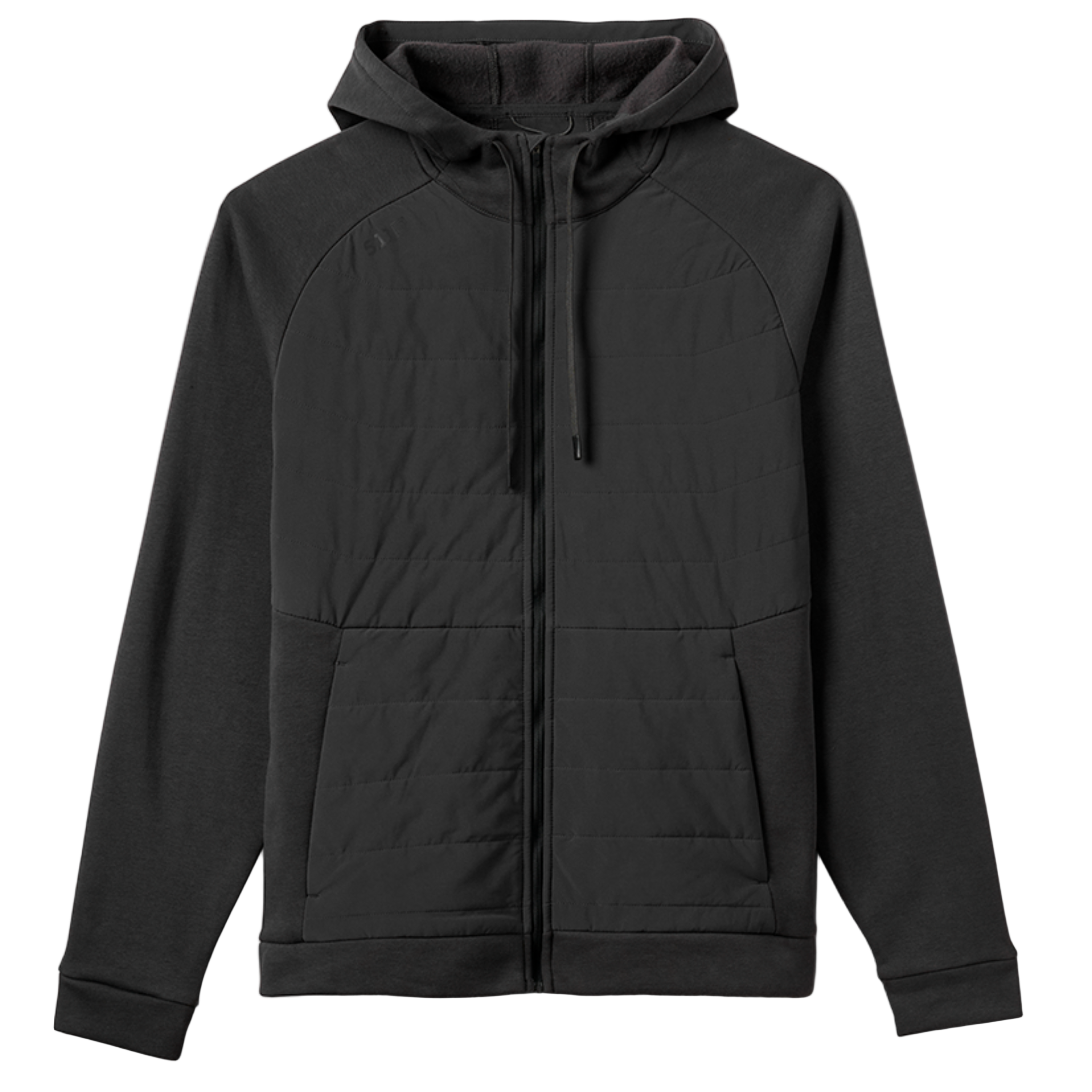Quilted and insulated front body panel with fleece sleeves, back, and hood