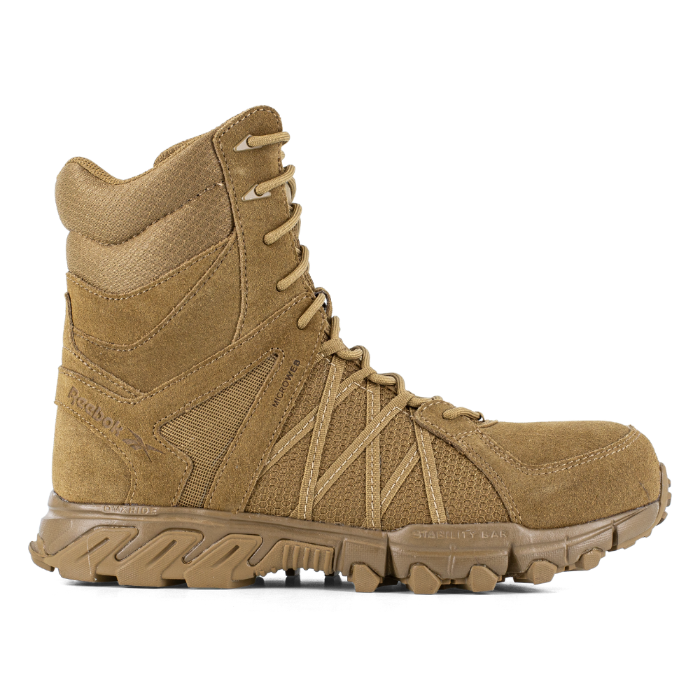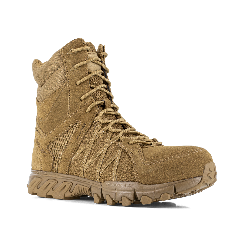 The Reebok Trailgrip Tactical 8" Side-Zip Boot is a high-performance soft-toe boot built for all-day comfort and rugged dependability. Part of the Trailgrip series, this 8-inch boot features a convenient YKK® side-zipper for rapid entry and exit. It is engineered with a MicroWeb lacing system for a secure fit and a Stability Bar in the forefoot to provide crucial lateral support during active movement.