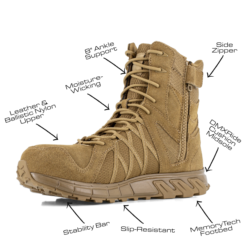 Reebok Work Tactical Boots are engineered with performance-driven tech for maximum comfort and support. MemoryTech foam insoles adapt to your foot for a custom fit, while EVA midsoles absorb impact and reduce fatigue. Slip-resistant rubber outsoles provide reliable traction, and moisture-wicking linings keep your feet cool and dry in any condition.
