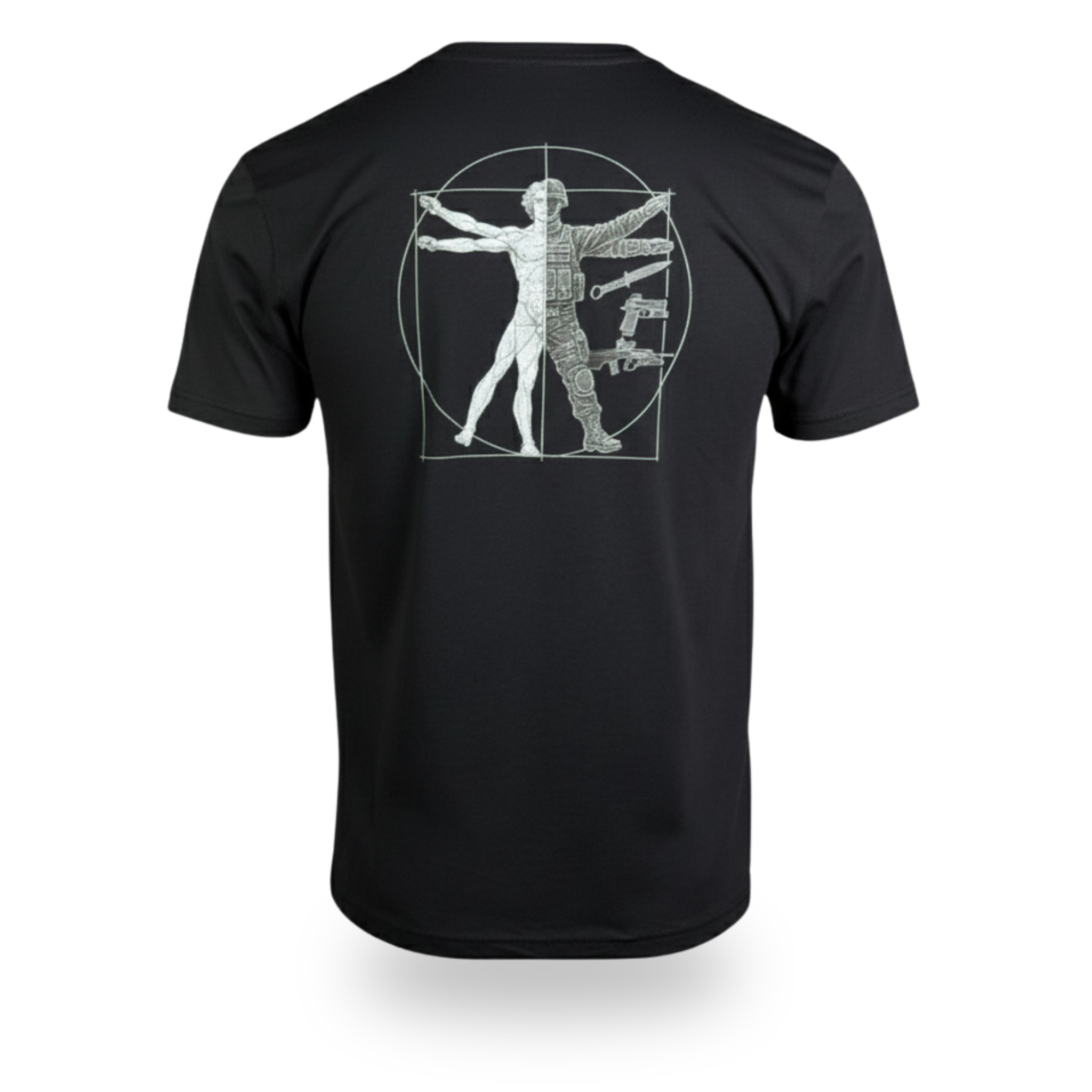 Tactical Back Graphic: “Vitruvian Operator” design symbolises balance, strength, and precision.